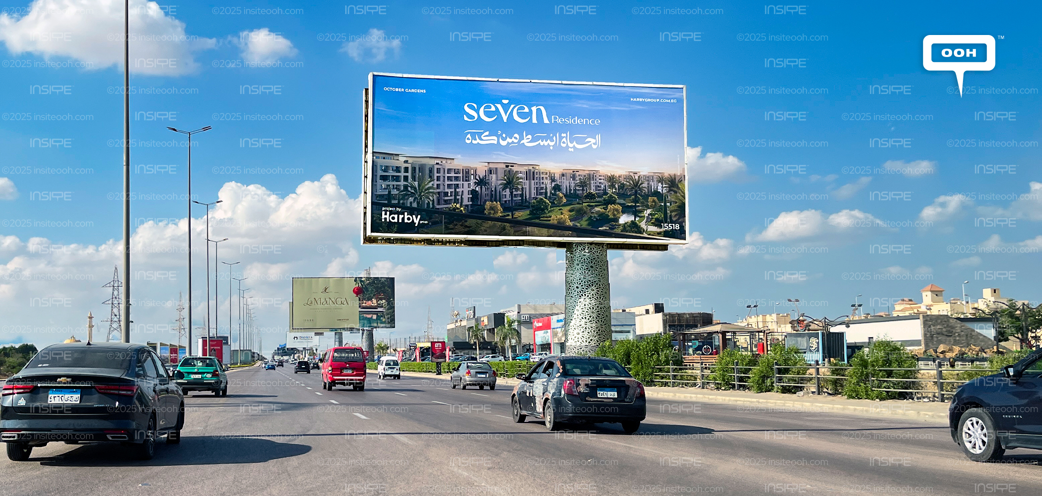 Billboards on main highways in October Gardens show two key visuals: a scenic render of the development nestled in greenery and a bold typographic treatment of the Arabic tagline: “Life is simpler than that”. The English brand name Seven Residence sits above the line, clean and unadorned.