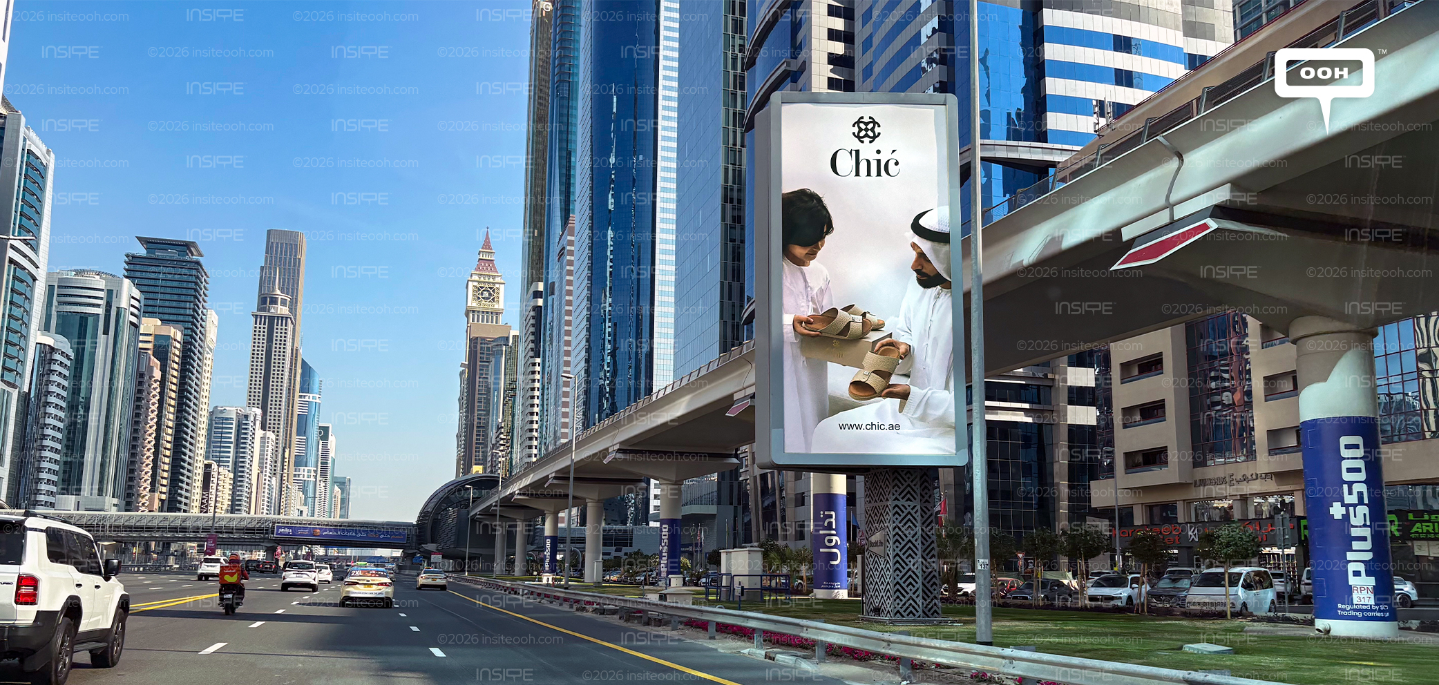 Other ad spaces feature elegant shots of women’s leather bags. All visuals are accompanied by the CHIC logo, while the Arabic line announcing the store's opening at City Centre Ajman grounds the message in immediacy and relevance. There is no clutter, no competing calls to action, just one clear takeaway delivered with poise. In a region where family, heritage, and continuity mean so much, CHIC speaks to values, not price points. This billboard doesn't just sell accessories, it sells trust, tradition, and shared taste across generations.