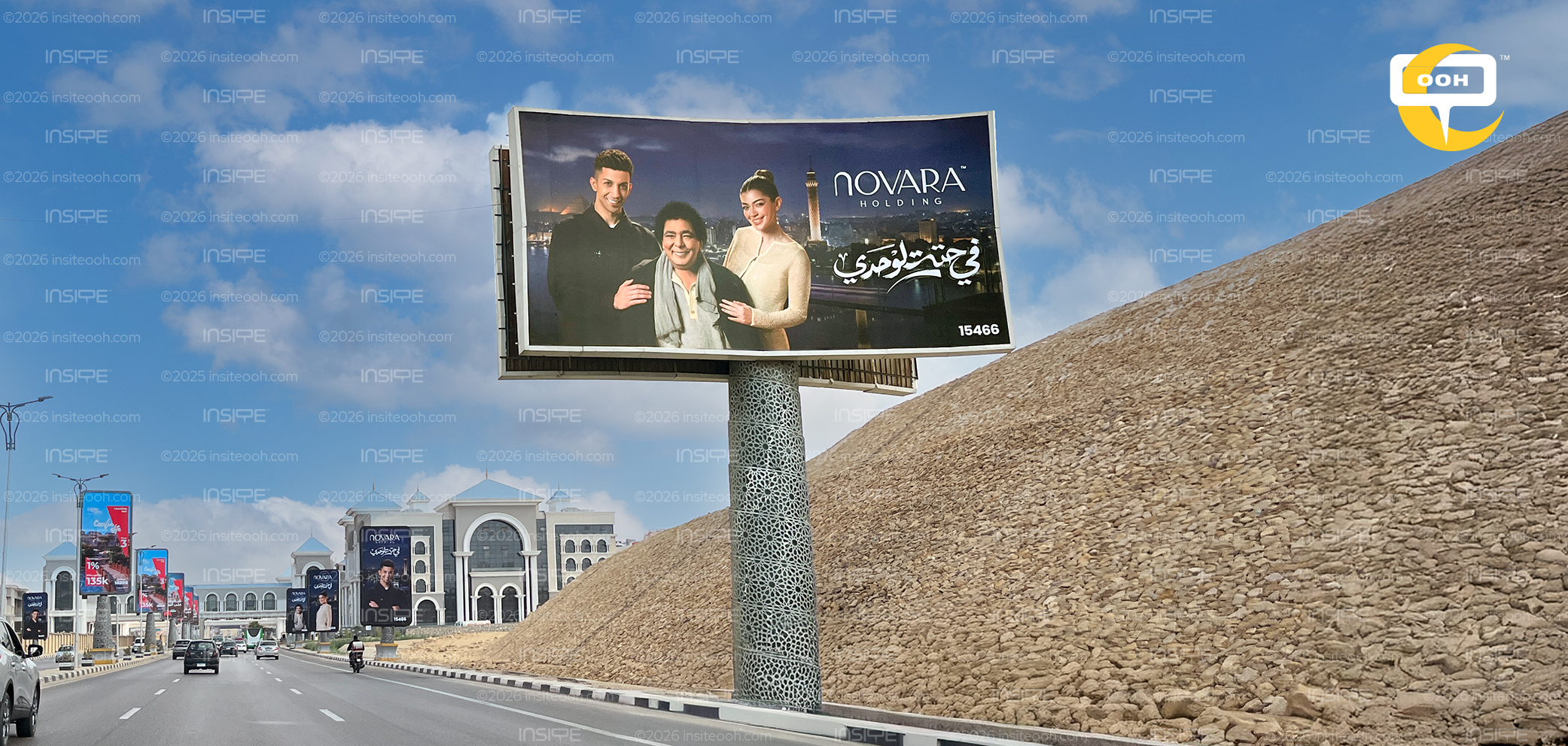 Came into Ramadan with a teaser campaign that built genuine anticipation, then spent that goodwill on a billboard that tries to do too much and lands on too little — three celebrities posed against a fabricated skyline that welds the Pyramids to the Cairo Tower as if geography were a mood board, with Mohamed Monir, the one name who carries real Ramadan soul, reduced to a third of a symmetrical trio rather than trusted to carry the frame he was born to own, and a tagline, "في حتة تانية," that had the warmth and colloquial pulse to anchor something memorable, buried under the visual noise of a campaign that confused budget with conviction.
